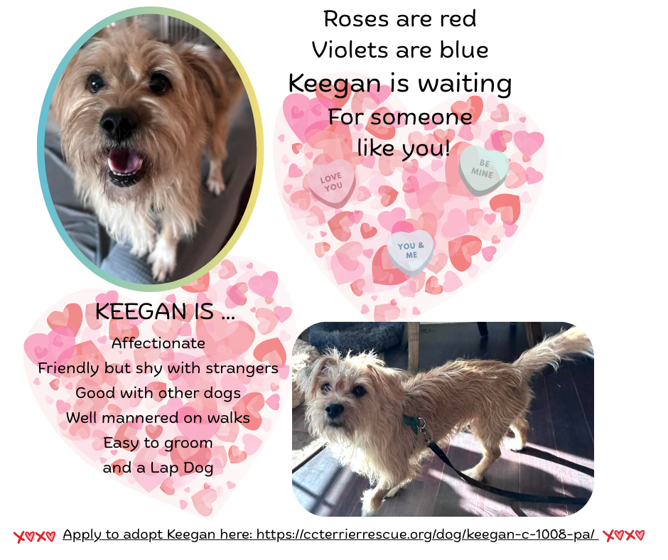 Say hello to a beautiful grey brindle boy who wants you to PLAY WITH HIM. Anthony is a 7 year old grey brindle Cairn Terrier boy. He will be ready for his forever home in... Biscotti's adoption fee has been pre-paid by a generous donor! Biscotti is a white-westie-hopeful and weighs barely 10 lbs soaking... Bradley Cooper is a young Cairn Terrier mix who is about 3 years old. He weighs 16 lbs, and he... Charlene is a 5-year-old beautiful cream-colored female cairn terrier. Chester's adoption fee has been pre-paid! We’re sure that Chester will find his adoring forever family in no time at... Danny Boy is la 2 year old wheaten boy who will be looking for his forever home soon. Jazzy is an active young Cousin Terrier, only two years old, demurely white in color with pretty grey accents. This... Julia is a 5-1/2-year-old beautiful wheaten-colored female cairn terrier. Kaylee is a tiny grey-brindle terrier who weighs just 11 lbs. She was found as a stray in northern California.... Keegan's adoption fee has been pre-paid! Meet Keegan! Keegan is a small, 15.6 lb mixed wheaten boy. . . Maestro is just a slip of a boy, barely 11 lbs, with soft searching brown eyes. His coat is as... Mary Jo is a 5-year-old beautiful red brindle female cairn terrier who loves attention and will snuggle with you, but... Nicholas' adoption fee has been pre-paid! Nicholas is a true cuddle-bug who's sure to steal your heart. Rennie is a happy, affectionate 13 year old black brindle cairn terrier boy. He came to us an owner surrender.... Rissa is a sweet and friendly Westie girl that was picked up off the street by a local rescue. Rissa... Sallie Mae's adoption fee has been pre-paid! Sallie Mae is a sweet all-terrain kind of gal, city or country, gentle... "Salty" is my name and Salty is my game. I am a happy 10 year old, 21 lb cairn boy... Seamus's adoption fee has been pre-paid! Please join us in welcoming in this little senior brindle Cairn boy we are...