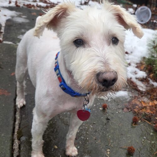 2/18/2026. Lewis is a unique white/platinum‑coated Miniature Schnauzer. He is still adjusting to his foster home, but he should be ready for his new home soon. Please check back to see when he is available.